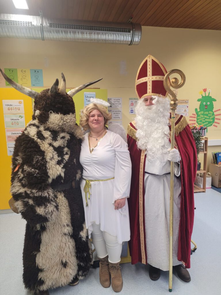 Am 5.12. bekamen die ersten und zweiten Klassen Besuch vom Nikolaus mit Knecht Ruprecht und seinem Weihnachtsengel.